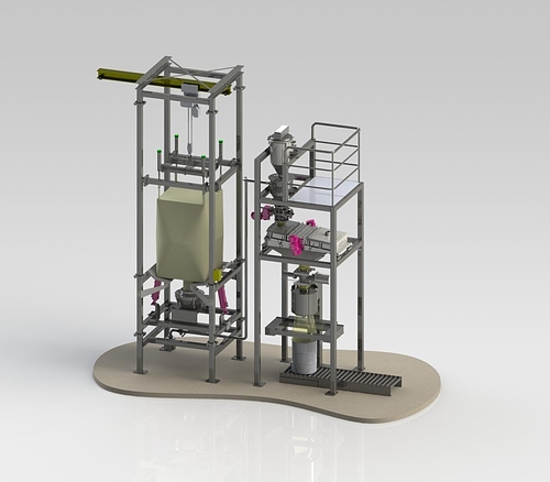 噸袋卸料站是用來實(shí)現(xiàn)袋裝散料的卸料功能,為半自動設(shè)備,其工作原理及操作流程為: